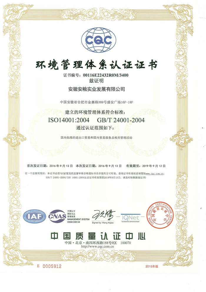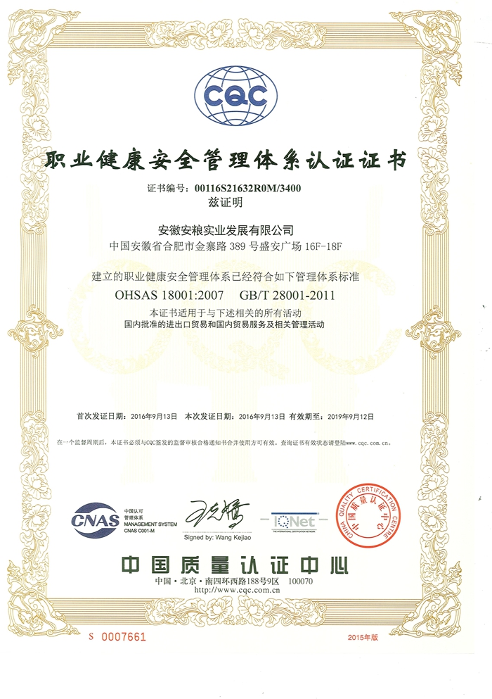 近期,安糧實(shí)業(yè)順利通過中國質(zhì)量認(rèn)證中心審核,在ISO9001認(rèn)證的基礎(chǔ)上又取得了ISO14001環(huán)境管理體系和OHSAS18001職業(yè)健康安全管理體系認(rèn)證證書。證書的獲得標(biāo)志著安糧實(shí)業(yè)建立了完整國際化管理體系,實(shí)現(xiàn)了ISO9001、ISO14001和OHSAS18001三個(gè)體系并行運(yùn)轉(zhuǎn),必將促進(jìn)公司生產(chǎn)經(jīng)營活動(dòng)更上一個(gè)臺階。