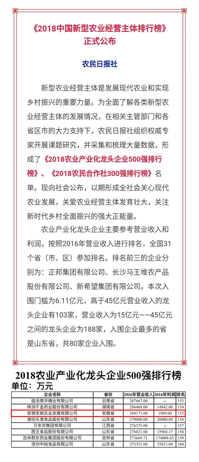 熱烈祝賀安糧實業(yè)位列《2018農(nóng)業(yè)產(chǎn)業(yè)化龍頭企業(yè)500強排行榜》第155位