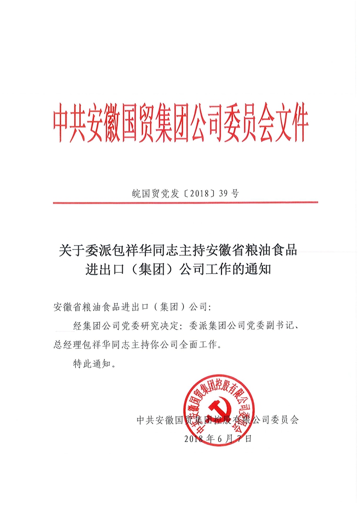 按照會(huì)議安排,首先由李明輝同志受國貿(mào)集團(tuán)黨委委托宣讀《關(guān)于委派包祥華同志主持安徽省糧油食品進(jìn)出口(集團(tuán))公司工作的通知》,包祥華同志、范陽同志先后講話。