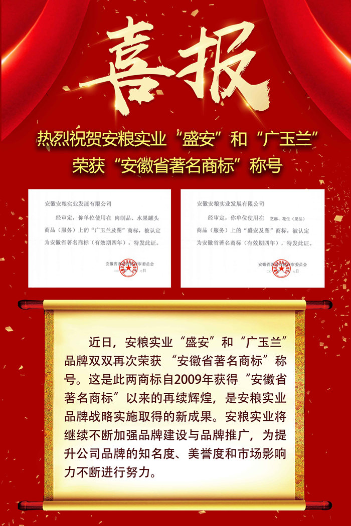 熱烈祝賀安糧實(shí)業(yè)“盛安”和“廣玉蘭“ 榮獲“安徽省著名商標(biāo)”稱號(hào)