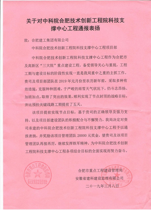 38日,由合肥建工六分公司施工管理的中科院合肥創(chuàng)新院科技支撐中心項目,受到建設單位中科院合肥技術創(chuàng)新工程院、合肥市重點局、安徽建科監(jiān)理公司下文表彰及重金獎勵。