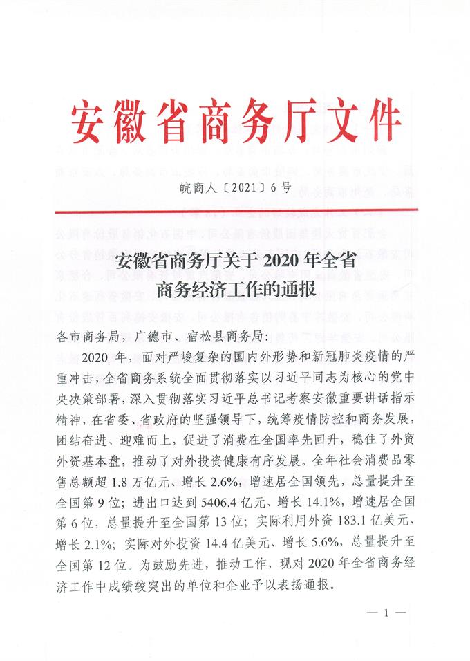 全省商務(wù)工作電視電話會(huì)議2021121日上午在合肥召開。會(huì)上,省商務(wù)廳張箭廳長(zhǎng)對(duì)2020年全省商務(wù)經(jīng)濟(jì)工作中成績(jī)較突出的單位和企業(yè)予以表?yè)P(yáng)通報(bào)。