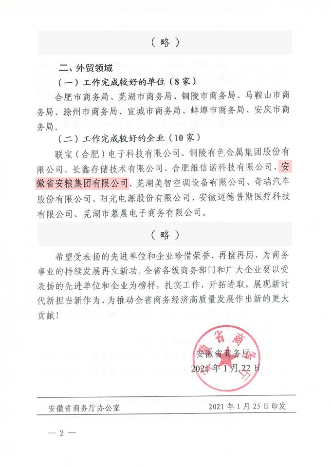 安糧集團(tuán)2020年以進(jìn)出口額超22.46億美元(海關(guān)統(tǒng)計(jì)),增速超28.56%的業(yè)績(jī),作為省內(nèi)唯一一家入圍的專業(yè)外貿(mào)公司榮獲省商務(wù)廳的表彰。