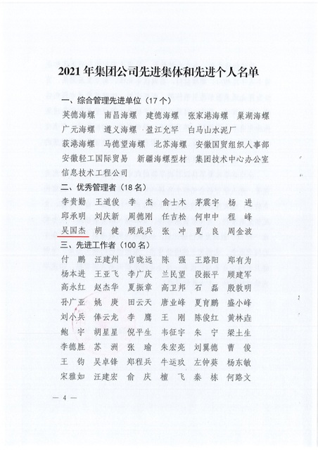 近日,海螺集團公布《關于表彰2021年集團公司先進集體和先進個人的決定》,表彰了17個“綜合管理先進單位”、18名“優(yōu)秀管理者”和100名“先進工作者”。安糧集團副總裁、安糧實業(yè)董事長吳國杰被授予“先進管理者”榮譽稱號,安糧國際總經理助理張偉、安糧期貨河南分公司總經理楊克斌、合肥建工技術中心副主任鄭志濤等三人榮獲“先進工作者”榮譽稱號。