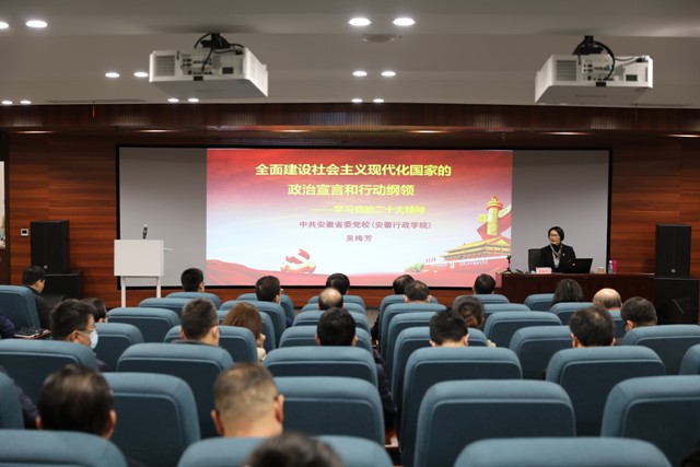 吳教授以《全面建設(shè)社會主義現(xiàn)代化國家的政治宣言和行動綱領(lǐng)——學(xué)習(xí)黨的二十大精神》為主題展開宣講,她介紹了黨的二十大召開的特殊背景和重大意義,從黨的二十大的主題和主要成果、黨的二十大報(bào)告的基本內(nèi)容和核心要義、學(xué)習(xí)宣傳貫徹黨的二十大精神三個(gè)方面,深入淺出、融會貫通地分析了本次會議提出的各項(xiàng)突破、首次創(chuàng)新以及細(xì)微變化背后的深刻含義,為抓好黨的二十大精神的大學(xué)習(xí)、大宣傳、大貫徹工作指明了方向、提供了思路。