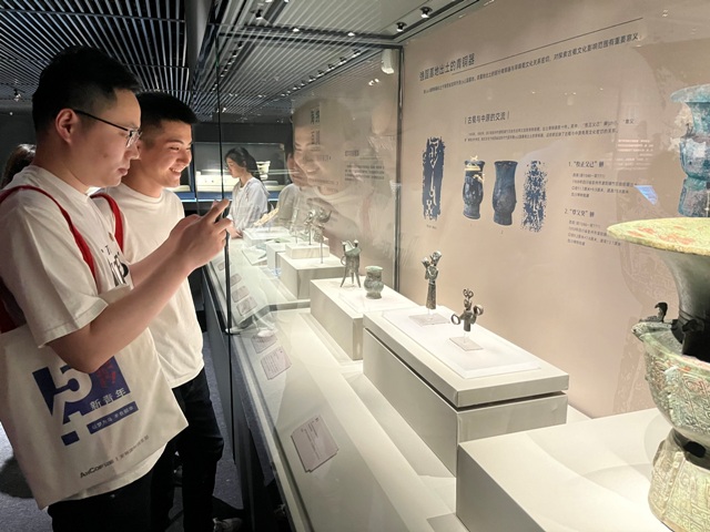 團(tuán)員青年們首先集體參觀了“三星堆?長江流域青銅文明展”。作為二十世紀(jì)人類最偉大的考古發(fā)現(xiàn)之一,三星堆遺址被譽(yù)為“長江文明之源”。通過生動(dòng)詳實(shí)的介紹,團(tuán)員們深入了解了黃金面具、青銅人像等三星堆“頂流”文物,領(lǐng)略了長江流域青銅文明的歷史光輝和璀璨成就。