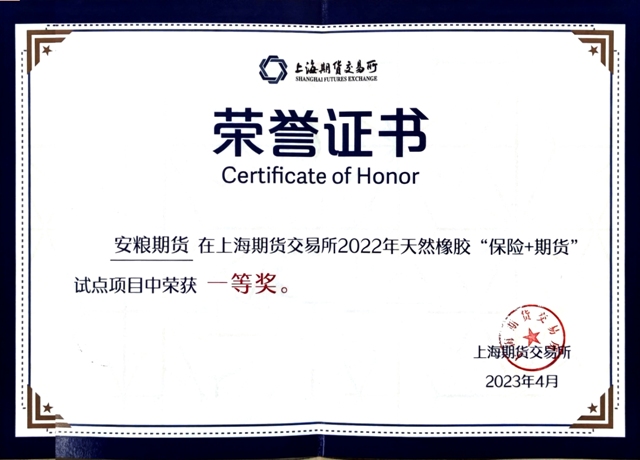 近日,上海期貨交易所對(duì)2022年天然橡膠“保險(xiǎn)+期貨”試點(diǎn)項(xiàng)目進(jìn)行結(jié)項(xiàng)評(píng)審,安糧期貨在海南省樂(lè)東黎族自治縣開(kāi)展的“保險(xiǎn)+期貨”項(xiàng)目中表現(xiàn)優(yōu)異,榮獲2022年天然橡膠“保險(xiǎn)+期貨”試點(diǎn)項(xiàng)目一等獎(jiǎng)。
