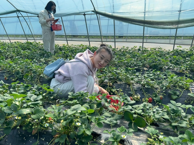 連片的草莓棚里,顆顆草莓飽滿、香甜,透著勃勃生機(jī),甜蜜的香氣撲鼻而來。大家按捺不住興奮的心情,提著小框穿梭在草莓田間精挑細(xì)選,或駐足合影、或互相幫助,不一會兒,筐子里已是碩果累累,收獲的喜悅溢于言表。采摘的同時,果園負(fù)責(zé)人還為大家介紹了草莓品種、草莓的栽培方法和現(xiàn)代農(nóng)業(yè)發(fā)展?fàn)顩r。