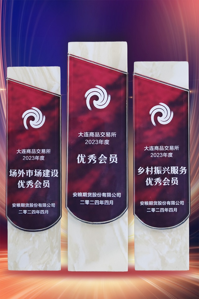 2024年4月8日,安糧期貨在大連商品交易所2023年度優(yōu)秀會員表彰中榮獲“優(yōu)秀會員”、“場外市場建設(shè)優(yōu)秀會員”、“鄉(xiāng)村振興服務(wù)優(yōu)秀會員”三項殊榮。