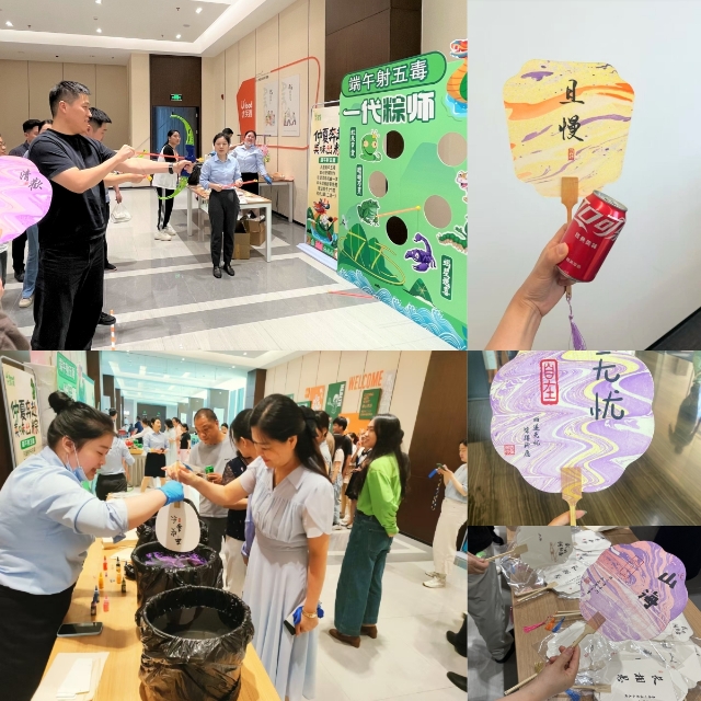 529,在公司餐廳開(kāi)展的仲夏奔赴?美味出粽端午趣味活動(dòng),吸引眾多員工熱情參與?;顒?dòng)現(xiàn)場(chǎng)最具人氣的端午射五毒游戲,參與者手持弓箭瞄準(zhǔn)背景板上的蛇、蝎等五毒圖案,在體驗(yàn)傳統(tǒng)民俗競(jìng)技樂(lè)趣的同時(shí),寄托驅(qū)邪避毒、祈福安康的心愿。同步開(kāi)展的非遺漆扇制作活動(dòng)讓員工通過(guò)親手創(chuàng)作進(jìn)一步深化對(duì)非遺文化的認(rèn)知。成品扇子上,“山?!薄盁o(wú)憂”“且慢”等字樣與端午元素、傳統(tǒng)書(shū)法相映成趣。